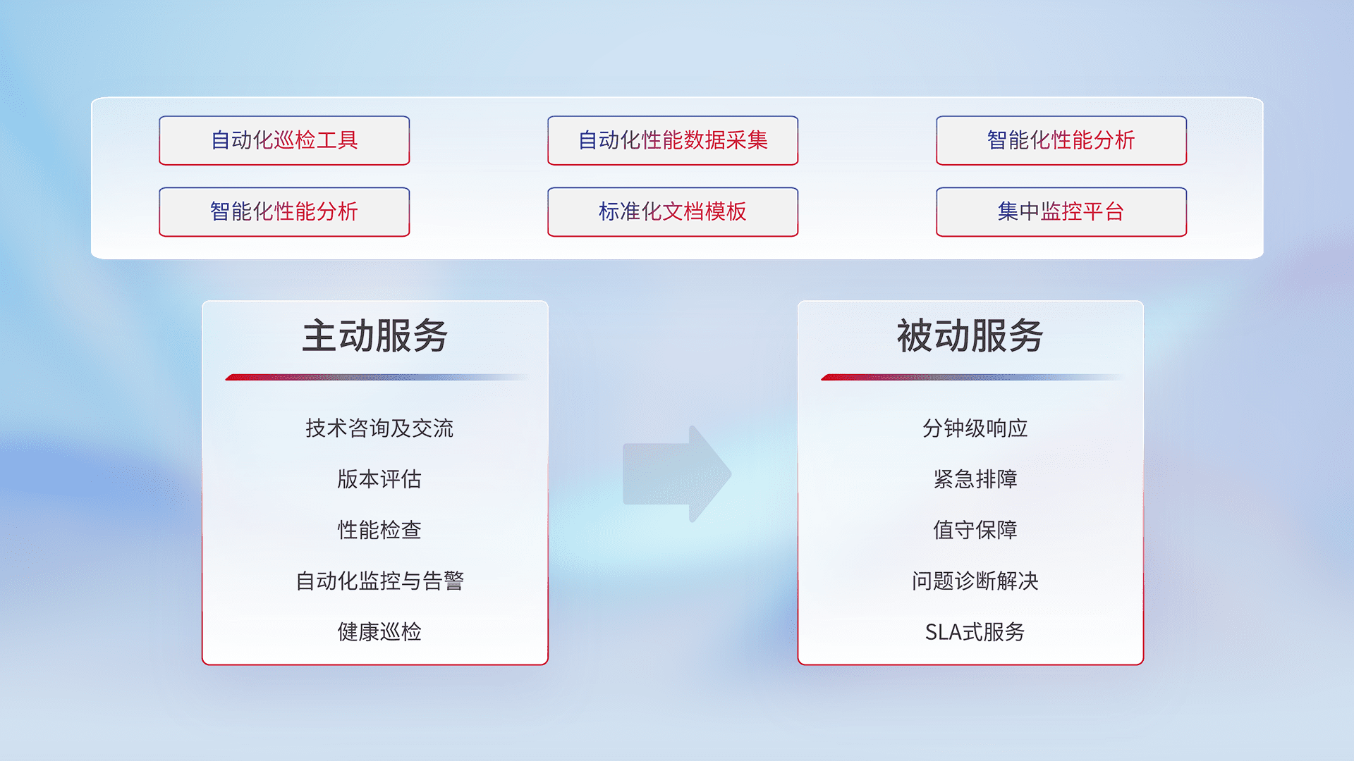 智能化工具和标准化文档,,保障服务质量,,,,提供主动服务(包含技术咨询、、、版本评估、、、、性能检查、、自动化监控与告警、、健康巡检)和被动服务包含(分钟级响应、、、紧急排障、、值守保障、、、问题诊断解决、、、、SLA服务)。。